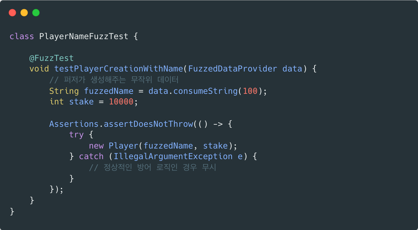 JUnit과 통합하여 fuzzing을 수행할 수 있다. Jazzer는 JUnit 기반에서 동작할 수 있도록 @FuzzTest를 제공하며, 이를 통해 퍼즈 타겟을 테스트 코드 형태로 정의할 수 있다. 앞서 말했다시피, 이처럼 기존 테스트 코드와 유사한 방식으로 fuzz test를 작성할 수 있다는 점은 Jazzer의 실무적인 큰 장점이다.