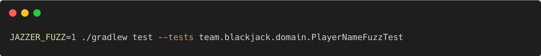 지난 주차까지 진행한 블랙잭 미션을 기반으로, 실제로 Fuzz Testing을 적용해보자. 간단한 예시로 Player의 이름 입력 값에 대한 fuzzing을 수행하였다. Player의 이름은 아래 검증 규칙을 따르며, 해당 규칙을 기준으로 다양한 입력을 자동으로 테스트하게 된다.