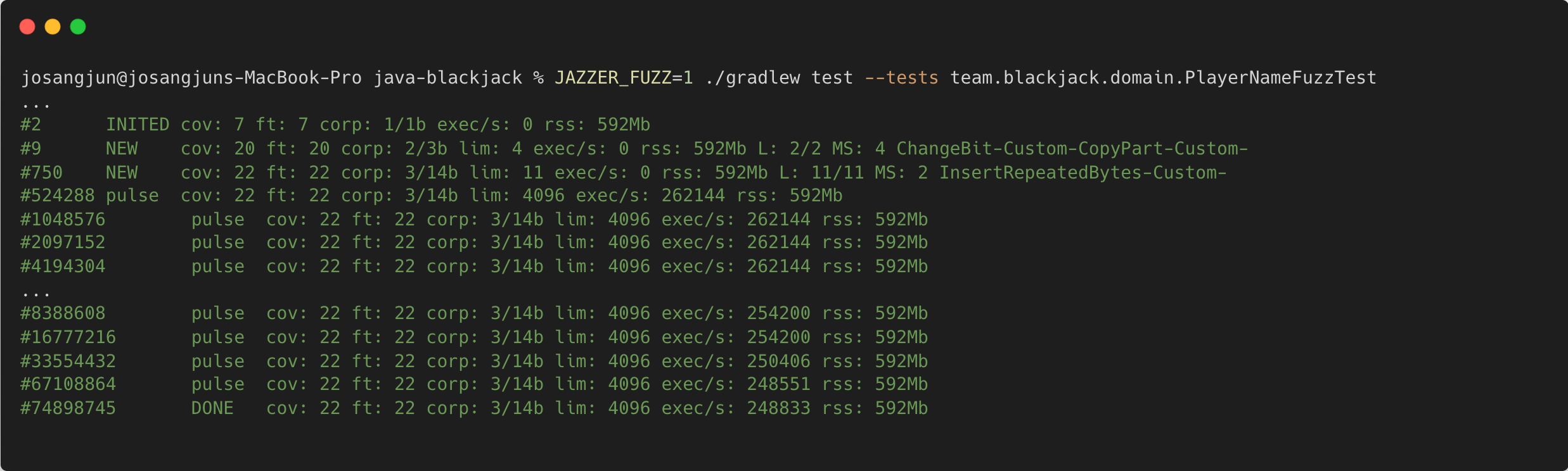위의 로그를 보면 다음과 같은 결론을 도출할 수 있다. 먼저, 단 몇 분 만에 7,400만 개의 무작위 케이스를 테스트 수행했다. 이는 일반적인 단위 테스트였다면 사람이 일일이 수천만 개의 이름을 입력했어야 했겠지만, 퍼징은 초당 24만건의 속도로 우리가 놓칠 수 있는 엣지 케이스를 검증해냈음을 의미한다. 또한, 결과적으로 DONE이 찍혔다는 것은 예외 케이스가 발생하지 않았다는 점이다.