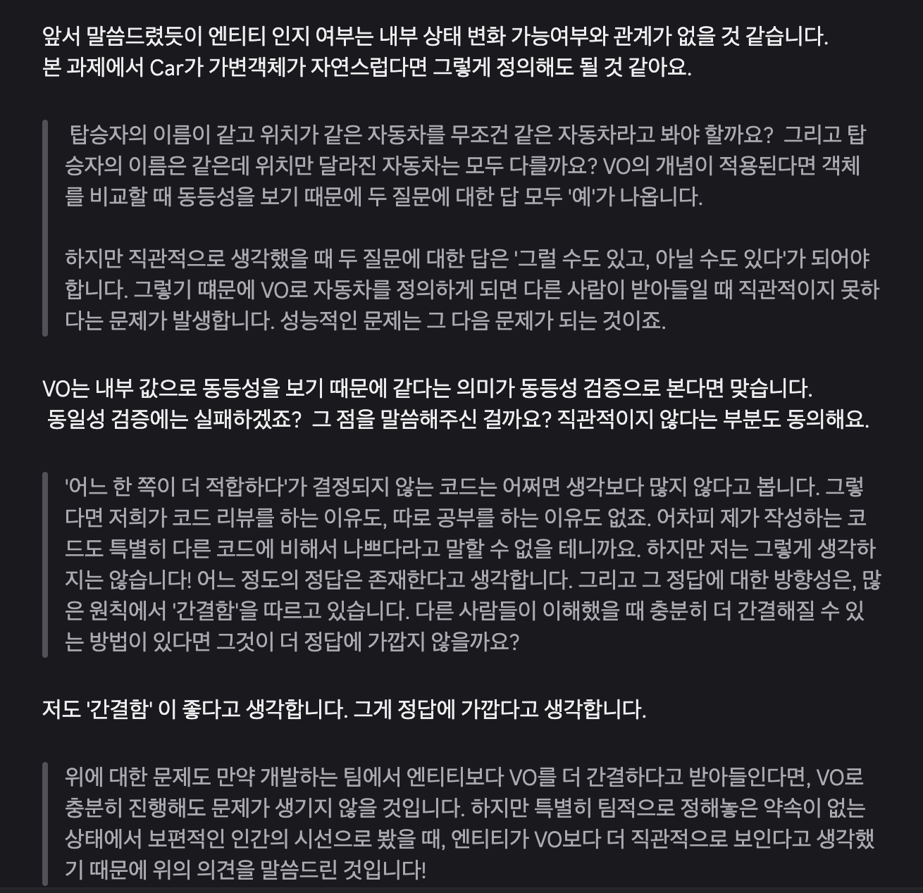 결국, VO를 사용해서 얻는 이점인 불변과 동등성 비교가 해당 어플리케이션에서는 굳이 필요하지 않기에, 자연스럽고 직관적인 상태 변경 가능한 타입으로 작성하는 것이 더 이점이 있다는 점이었다. 같은 맥락으로 정답에 가까운 방향은 간결성에 있다라는 의견도 공감할 수 있었다. 내가 Entity를 택했었던 이유를 가장 명확하게 표현해주신 용어 같았다.