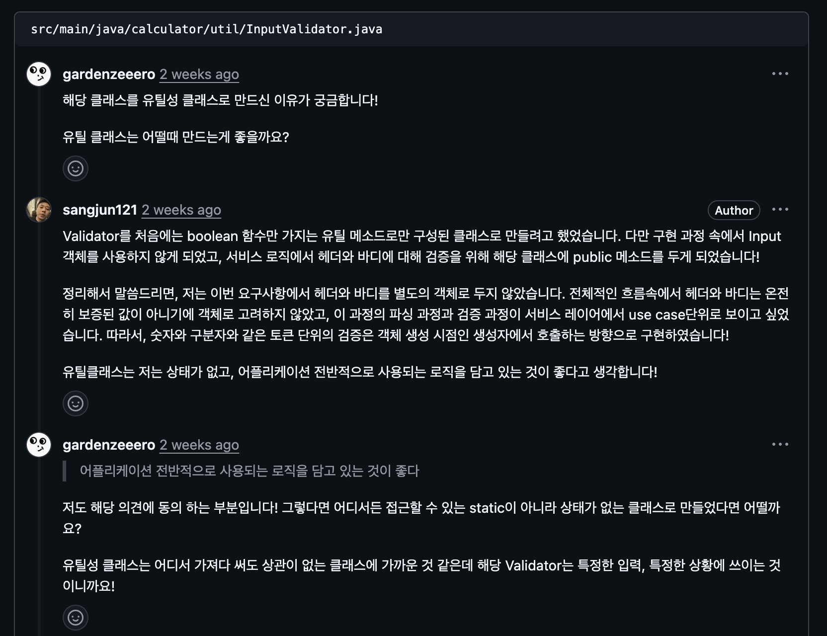 따라서, 해당 객체는 입력 값에서 사용되는 검증 로직만 지닌 일반 클래스로 구현하는 것이 더 올바르다는 판단을 하였다. 즉 어플리케이션 전역에서 사용되는 메소드를 모아둔 클래스가 아닌, 특정 도메인 클래스에서만 사용되는 로직인 것이다. 결국, static 키워드로 어플리케이션 전반에 공유될 필요가 없다.